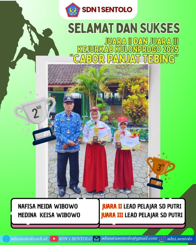 Semangat dan bakat luar biasa ditunjukkan oleh siswi-siswi dari SD Negeri 1 Sentolo dalam ajang bergengsi Kejuaraan Panjat Tebing Kabupaten Kulon Progo tahun 2025, yang diselenggarakan oleh FPTI Kabupaten Kulon Progo. Dalam kategori Lead Pelajar Putri, dua bersaudara dari SD N 1 Sentolo berhasil mengukir prestasi membanggakan. Nafisa Meida Wibowo sukses meraih Juara 2, menunjukkan ketangguhan dan fokusnya dalam menaklukkan jalur panjat. Tak kalah hebat, sang adik Medina Keisa Wibowo juga berhasil menyabet posisi Juara 3. Pencapaian ini tidak hanya mengharumkan nama sekolah, tetapi juga menjadi bukti bahwa pembinaan dan potensi atlet muda panjat tebing di Kulon Progo, khususnya dari tingkat Sekolah Dasar, sangat menjanjikan. Selamat untuk Nafisa dan Medina atas dedikasi dan prestasi gemilang ini!